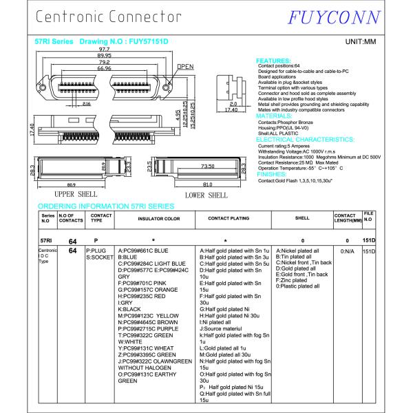 FUY57151D-64P 90 Degree Black Cover 32 Pairs Male Plug Champ Connector 64 pin IDC Type