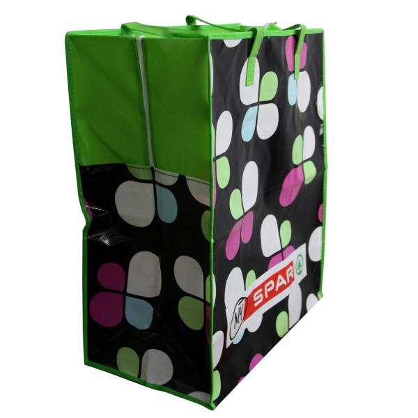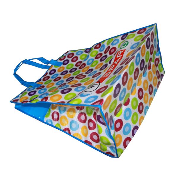 | Material: | 140gsm shining coat PP woven fabric 4 color printing 4 sides, bottom plain, body material webbing, plastic zipper | |