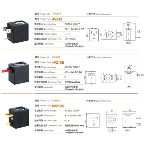 Electromagnetic induction coils for pneumatic solenoid valve application, voltage DC12V, DC24V, AC110V, AC220V, power consumption AC:4VA~30VA, DC:3W~48W,electricity connecting socket type,wire outleading type ,insulation class F/H e.g 4V210