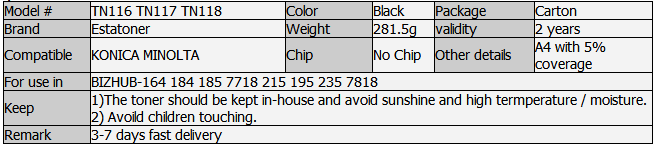 | TN-114 | Bizhub 162/163/180/181/210/211/7516/7521, DI152,DI152F,DI183,DI183F | 413g | |||||