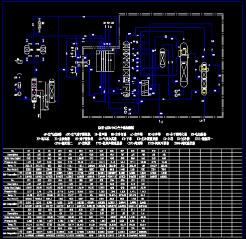After the feed air is cleaned of dust and mechanical impurities in air filter, it is compressed in air compressor to a certain pressure and then pre-cooled in air cooling tower. The water supply to air cooling tower is divided into 2 sections. The treated circulating water is used at the lower section of air cooling tower while the low temperature water cooled by water cooling tower is used at the upper section of air cooling tower. The wire-mesh screen demister is provided at the top of air cooling tower in order to prevent the moisture from being brought out and remove the water drops in air.