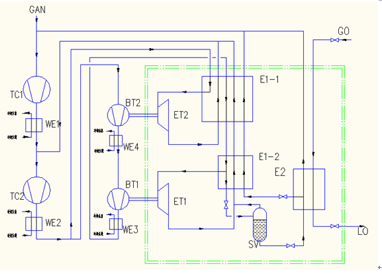 The low pressure nitrogen compressed through nitrogen compressor mixing with the reflux gas of liquefaction plant is compressed through the gas transmission nitrogen turbo-compressor. The compressed gas is divided into two streams. one stream is expanded by high temperature expander, and goes out of cold box after being rewarmed. The other one stream is boosted in series through the booster of the expander, and then it goes out of cold box with rewarmed through main heat expander after being expanded in the low temperature expander, and back to the inlet of circulating section of nitrogen turbo-compressor after being rewarmed in the main heat exchanger. Part nitrogen goes into the gas-liquid separator after being liquefied. The liquid nitrogen in the separator is subcooled in the liquid nitrogen subcooler, and then goes into the oxygen heat exchanger to cool oxygen, part of which is extracted and back to the main heat exchanger as reflux gas, and the rest liquid nitrogen goes out of heat exchanger and back to the inlet of circulating section of nitrogen turbo-compressor.