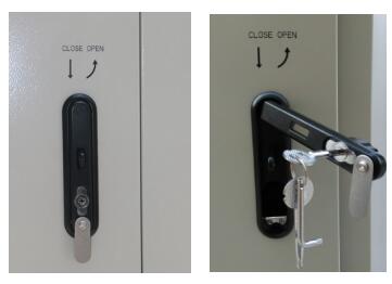 The cabinet includes one front door. The cabinet door uses embedded structure. The door opening angle is larger than 110°and the door limit device can limit the opening angle. The lock is theftproof three point lock, supporting padlock.
