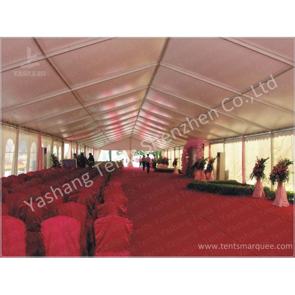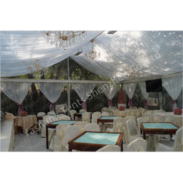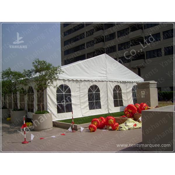 Sidewall fabrics of the white wedding party canopy are PVC-coated polyester textile with arched transparent PVC windows, so natural daylighting brightens the tent, saving much electricity energy consumption.