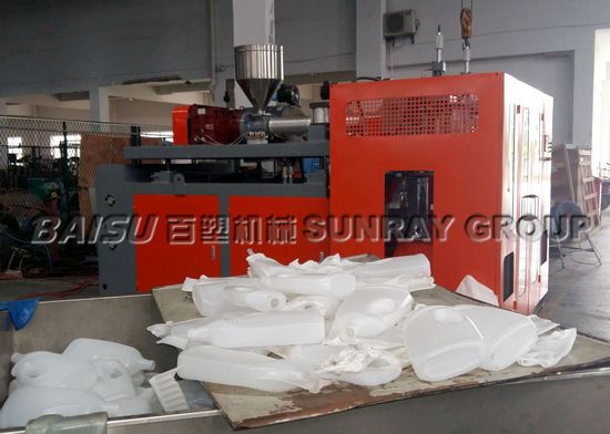 2.2 liter laundry detergent bottle automatic blow molding machine SRB70D-1 is widely used in hdpe engine oil jerry can making field, detergent bottle and liquid soap container making field, cooking oil and fresh water packing field, also used for other round or square containers. In normal production, the cycle time is about 30 seconds. Its production capacity is 240 pcs/hour, daily output is 5760 bottles. The key technical points lie in precise die and core size, blow pin head diameter and design, also the suitable depth of mould cutting overflow grooves to insure the on-line deflashing result. Besides EBM machine, we also provide on-line auto deflashing plastic bottle moulds, and auxiliary machines such as auto-loader, color mixer, scraps crusher, water chiller, air compressor, air accumulating tank, leakage tester, in-mold labeling machine and so on. We help customers to get one stop service of manufacturing, exporting and technical supports.