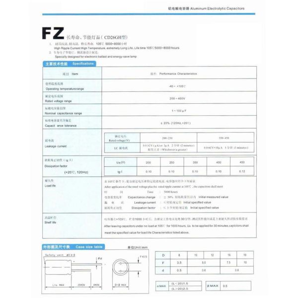 | Load life | After applying rated voltage for 2000 hours at +85 and then resumed 16 hours: Capacitance change: +/-25%. |