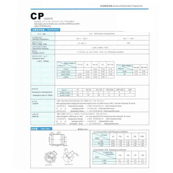 | Load life | After applying rated voltage for 2000 hours at +85 and then resumed 16 hours: Capacitance change: +/-25%. |