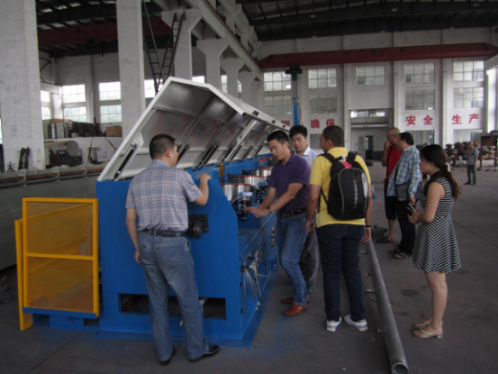 ② working way::straight line wire drawing machine control system adopt ac frequency conversion control, PLC logic control, full digital control, adopt imported high grade components, strong anti-interference ability, fast operation, is not only stable and reliable in operation, low energy consumption, and greatly improves the production efficiency, but also has multiple protection function, when shield equipment high speed open or have other fault occurs, the automatic stop device. After each machine is equipped with the points, the former linkage, linkage, the function such as start, stop, stop, work station of the main display, man-machine interface with the length of the preset speed preset display, fault query, equipment status, computer mold fitting, etc. the system generally using PLC programe control, frequency converter, touch screen to finish data exchange through communication, PLC can control reading, writing, turning on, turning off of frequency converter freely. PLC software can ensure programming and setting up automatic to the different drawing process, and it also can ensure operate smoothly; color screen man-machine interface can monitor the running conditions of equipment and fault display at anytime. Each process parameter can be set by the touch screen input. high precision, better accuracy, easy amendment, and can assure drawing process wider, realize jumping mould drawing easily. The whole system runs smoothly, low fault ratio, easy operation.