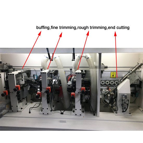 Functions: gluing, end cutting, rough trimming, fine trimming, buffing, scraping