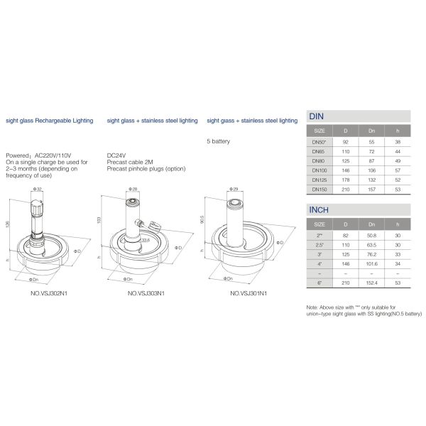 DN80 DC24V union type sight glass with stainless steel lighting and cable charging of waterproof design