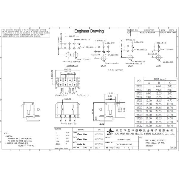 6. There are two kinds of wafers in C3030 series for wire to board connecting : C3030WV-F series and C3030WR-F series, The number of pin :02P to 12P, 2*01P to 2*12P.The gluey shell’s material is PBT, UL94-V0.The pins are brass, Tin-plated.