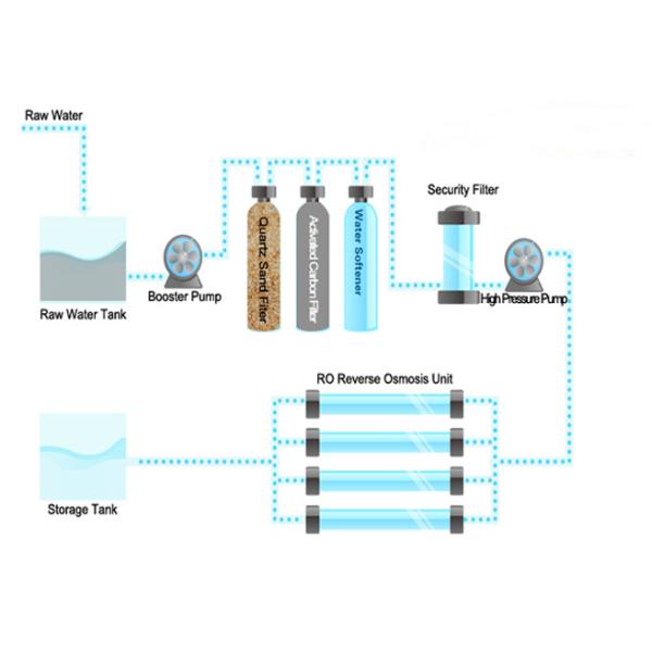 RO (Reverse Osmosis, RO), the basic working principle is: using of a special high pressure pump, increasing 6-20 kg pressure to raw water, then force raw water penetrating through 0.0001 micro reverse osmosis membrane under the pressure. Only water molecules and solvent less than 0.0001 microns can pass through the RO membrane. Chemical ionization, and bacterial, fungal, virus will flow with wastewater.