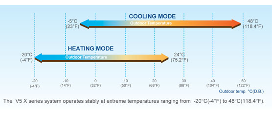 The outdoor units capacity range from 8HP up to 88HP in 2HP increment, max. combination of 4 basic models.