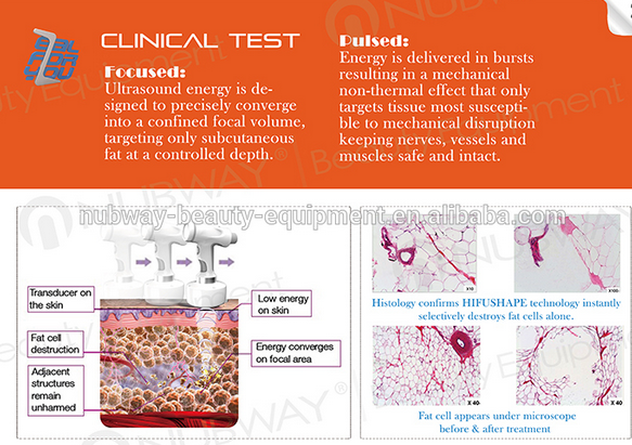 High Intensity Focused Ultrasound penetrates focused and volumetric ultrasonic energy at precise depth (1.2 cm) in subcutaneous fat layers targeting fat tissue causing a non-thermal effect. The surrounding structures such as the epidermis, blood vessels and nerves will not be damaged. Meanwhile the metabolized contents (triglyceride, fatty acid) of cells will excrete outside body automatically through blood circulation and lymphatic drainage without harm to the human body.
