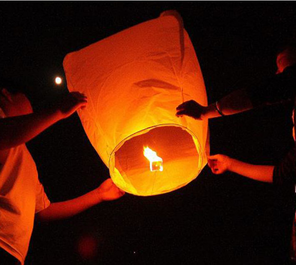 2. At the top of the wish lamp, one person lights the four corners of the fuel.