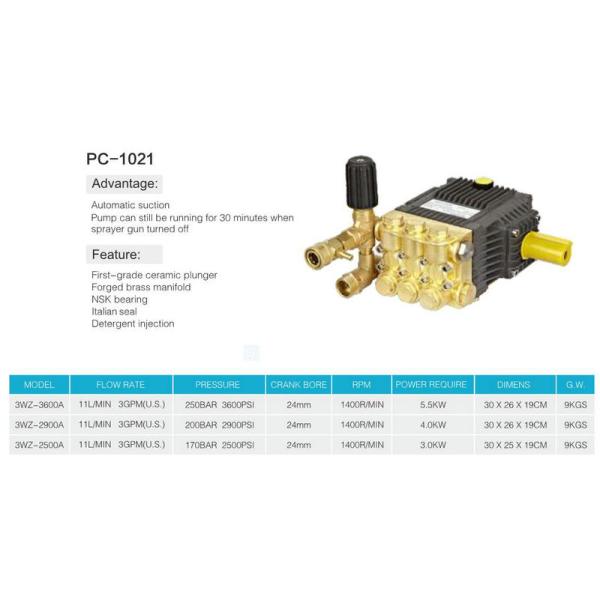 | 3WZ-2500A | 170BAR 2500PSI | 24mm | 11L/MIN 3GPM | 3.0KW | 1400R/MIN | 30*25*19CM | 9KGS |