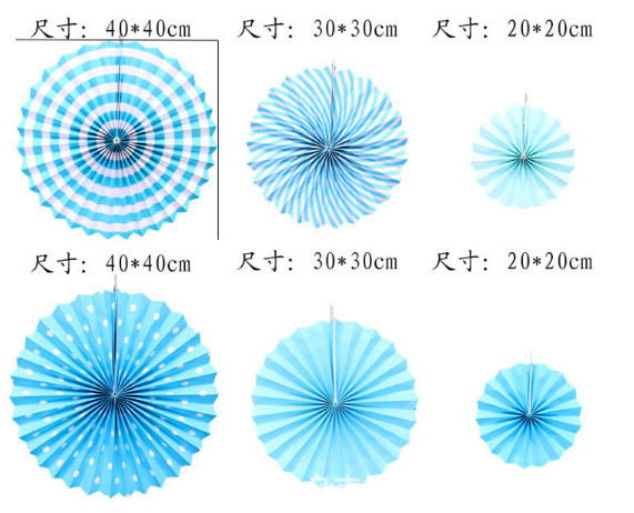 [product specifications] 2 diameter 40cm, 2 diameter 30cm. 2 diameter 20 cm, a total of 6 fan flowers to form a set, the product color is shown.