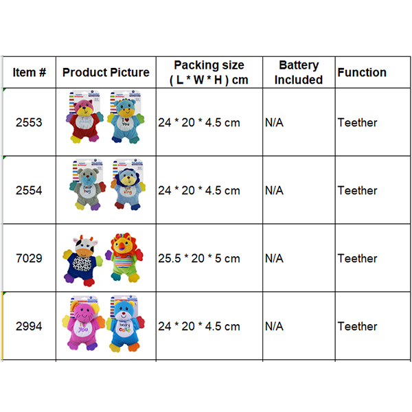 Plush teether toys displayed here, such as lion, milk cow, cat, bear, etc. they are just very few options for your reference, we still have a large number of other styles that to be present from time to time.