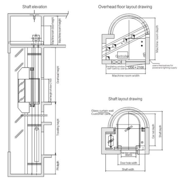| Persons | Load(kg) | Speed(m/s) | Net size of car(mm) | Net size of door(mm) | Shaft size(mm) | Machine room size(mm) | |||