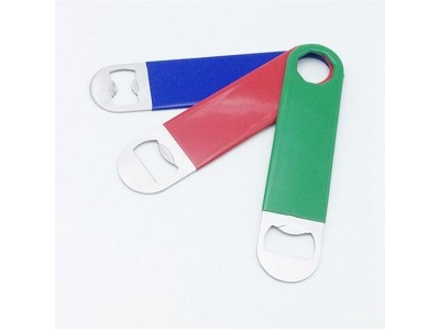 Stainless steel bar blade flat beer bottle opener, engraved logo, brushed metal