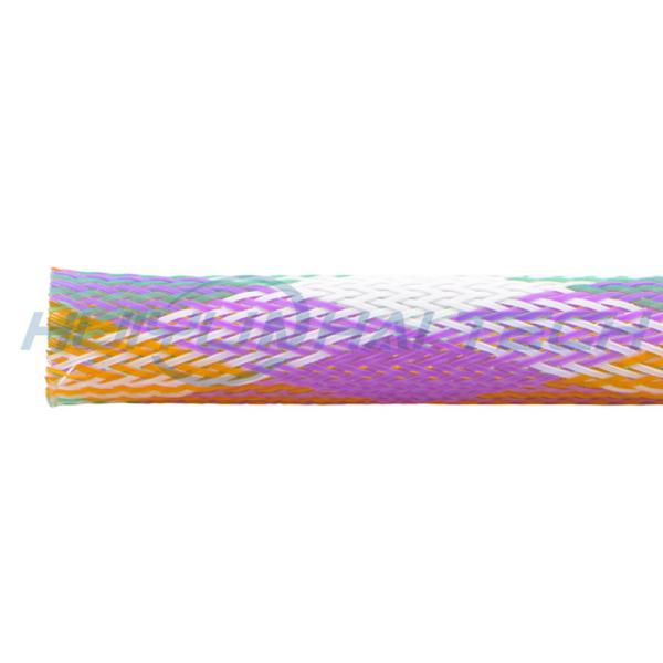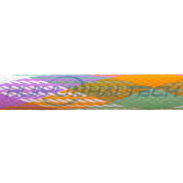 Pet expandable braided sleeve compiled by the Environmental Protection PET filament diameter monofilament 0.20mm or 0.25mm's made with good flexibility, flame resistance, abrasion resistance and heat resistance, network management can be easily expanded to the original 150% , and it is easy to tighten the various irregularly shaped objects, which can be maintained within a wide temperature range while maintaining a soft, can inhibit chemical corrosion, UV and friction, characterized by its unique mesh also has good ventilation, wire heat diffusion function in a timely manner.