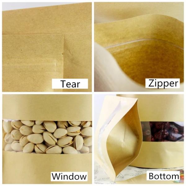 | Features | 1. FDA approved material, food grade 2. High moist-resistance 3. Eco-friendly kraft paper laminated 4. Self staning & resealable zipper |