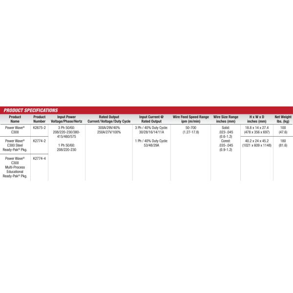 The Power Wave ® C300 is an advanced compact multi-process power source with an integrated wire feeder. It’s ideal for welding on a wide variety of materials, including aluminum, stainless, and nickel materials – where arc performance is critical.
