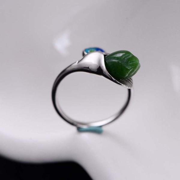 925 Sterling Silver Enamel Natural Jade Ring Open Adjustable Size (059850)