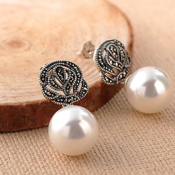 925 Silver Round 12mm White Simulated Shell Pearl Earrings Thai Style Jewellery (E12143)