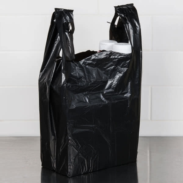 HDPE Material 1/6 Size .67 Mil Black Unprinted Embossed Heavy-Duty Plastic T Shirt Bag - 500/Case