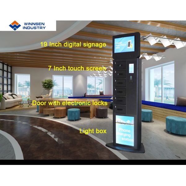 Winnsen Phone Charging Kiosk Installed with 19" Big Screen Digital Signage on Top
