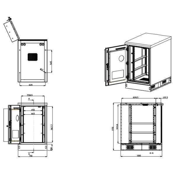 Structure | (1) One front door (2) Anti-theft three point lock(support padlock) (3) Door stopper is installed for keep door when door is open (4) Door with good sealing, waterproof and dustproof (5) Include standard 20U 19“ rack inside the cabinet, high compatibility. (6) Equipped with cable manager (7) Cable inlets at the bottom of cabinet | |
