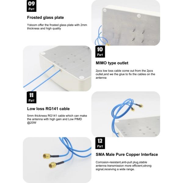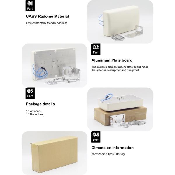 ELECTRICAL ▪ Frequency Range : 698-960/1710-2700MHz ▪ Impedance : 50Ω ▪ V.S.W.R : ≤1.5 ▪ Gain : 6/8DBI ▪ Radiation : Directional ▪ F/B ratio-dB : 10/15db ▪ Horizontal Beam width -° : 90°/ 75° ▪ Vertical Beam width -° : 80°/60° ▪ Isolation : 20dB ▪ PIM3-2W*43dBm : ≤-107dBm ▪ Polarization : Vertical/±45° ▪ Max power : 100W | MECHANICAL ▪ Antenna Cover : UABS ▪ Cable type : 2*RG141 blue ▪ Cable length : 2*30cm ▪ Connector Type : 2*N female ▪ Operating Temperature : -40℃~+60℃ ▪ Size : 295*180*72mm ▪ Antenna Weight : 0.96kg ▪ Moungting : Pole mounting ▪ Radiating Element Material : PCB ▪ Reflector Material : Aluminum ▪ Color : White ▪ Package :35*19*9cm/1pcs/0.96kg |