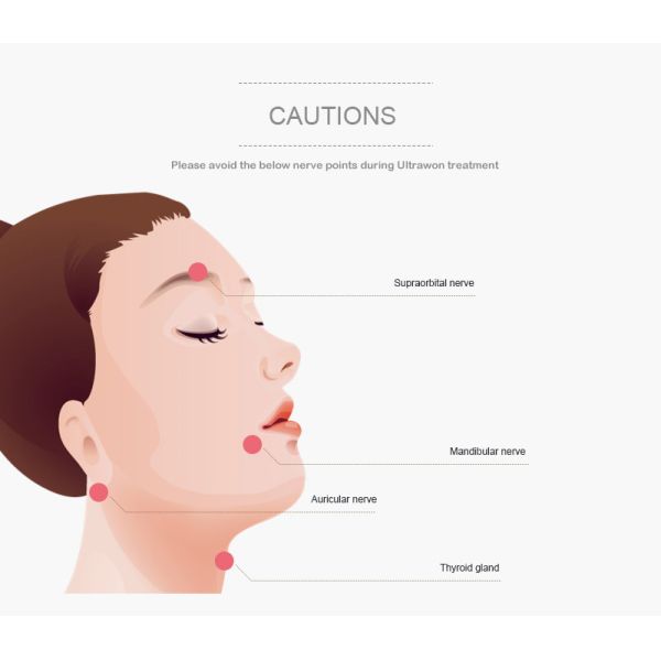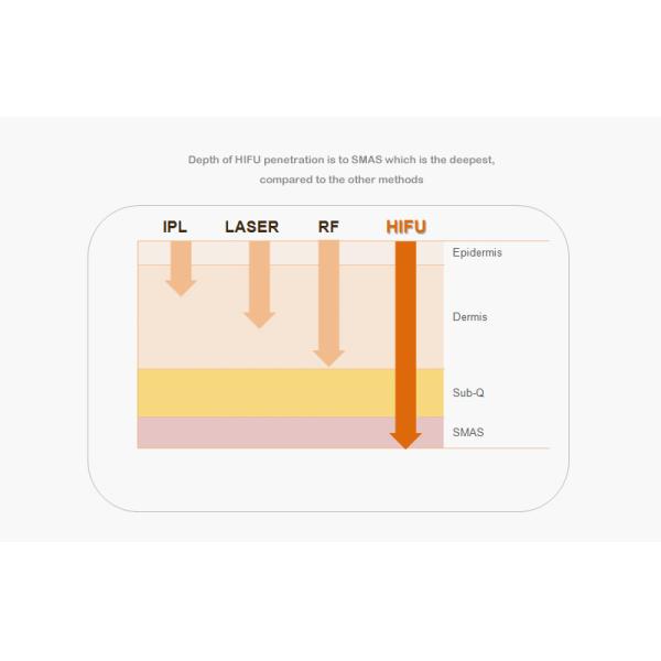 Use High intensity ultrasound focusing the treatment position, so that the skin tissue create the thermal, and make high speed friction cells to stimulate collagen. Such heat effect will not hurt the epidermis, because the treatment fast and direct access to the treatment site within 0-0.5 seconds, without touching the surrounding tissue ad can be passed directly to the superficial tendon membrane system(SMAS), so it can be done firm skin while pulling the muscle layer, thin face up to the progressive effect.