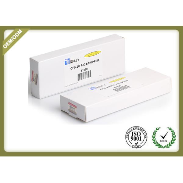 140 µm diameter hole and V-opening in blade allows removal of 250 micron buffer coating from 125 micron fiber