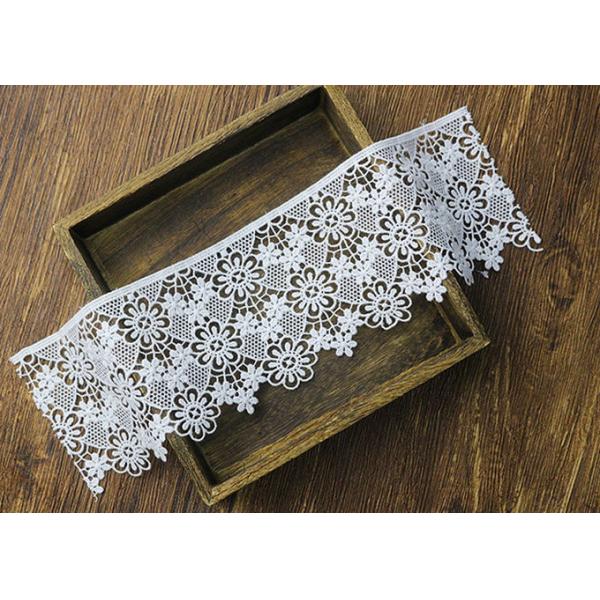 Guipure lace trims were sewing on water-soluble fabric, by dissolving parts of base fabric away in high-temperature water, embroidered patterns remain, also called water soluble lace, and it is suitable for women dresses, skirt, home textile, curtain, bedding articles, apparel, handicraft, blouse, etc.