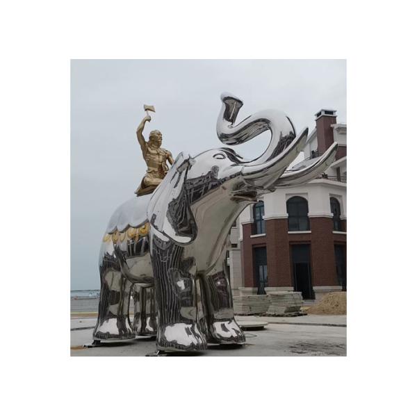 This is stainless steel sphere sculpture. The sculpture is man made of brass sitting on a polished stainless steel elephant. The sculpture looks amazing as it combines two materals together, the brass man and stainless steel elephant. This sculpture will create a striking foal point when it is placed outdoor in public.