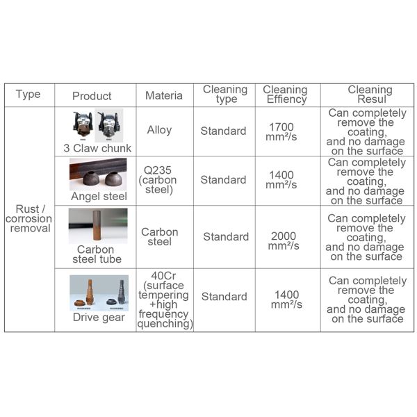 This machine has a good cleaning effect on iron, carbon steel plate, stainless steel plate, die steel gear, aluminum plate, no putty paint and other materials can be used to clean the oxide layer, the surface paint stripping paint; surface cleaning oil, stains, dirt; remove the surface coating; stone surface to remove dust and attachments; rubber mold residue clean. It can meet the requirements of equipment cleaning in the ship building industry, auto parts, rubber molds, high-end machine tools, tire molds, rails, environmental protection industry and other fields.