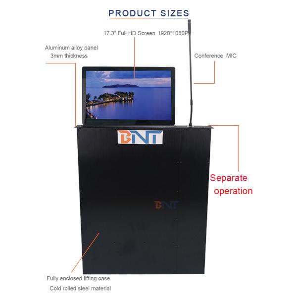 BNT LCD monitor lift mechine device, is a new office conference furniture furniture. This mechine is consisting of slim LED monitor screen, conference microphone and the automatically lifting mechanism. It is mounting on the conference table and connected to the computer. Do not pile up many monitors on the desk, no need to worry about the theft or damage of the display. The LED monitor screen is hidden under the table surface when didn't used, at the same time, it also ensures that the table top is clean and beautiful and saves space. The utility model has the functions of theft prevention, dust prevention, keeping the table top smooth and beautifying the tabletop.