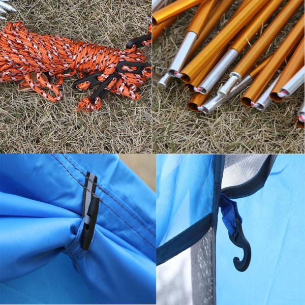 Material: | Rainfly: 210T Polyester fabric with PU coating Water resistant Inner tent: 190T Polyester taffeta fabric Flooring: 210D Oxford cloth Waterproof index:2000mm to 3000mm 8.5mm Aluminum Alloy Pole We could also make it as the materials you prefer. |
