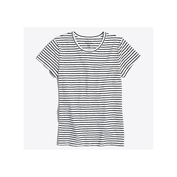 2 . Women's t-shirts are black and white stripes inside and outside, with ribbed knit trim on the round neck, straight style, and stylish.