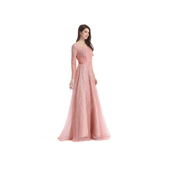 Pink V Neck Arabic Evening Gowns , A - Line Long Sleeve Arabic Party Dress