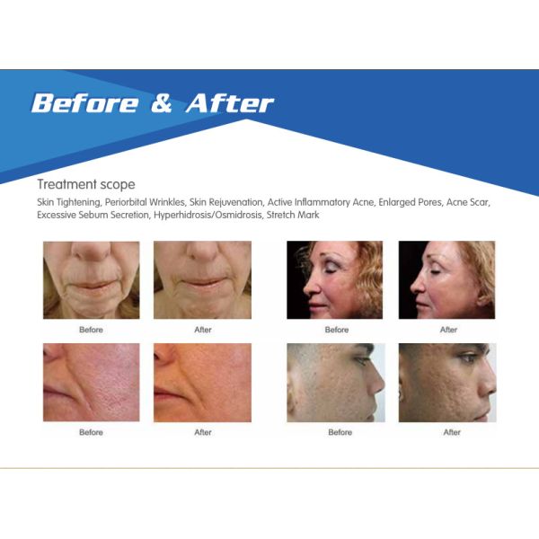 Fraction RF is better than Fractional Co2 laser,Since Fractional laser is single wavelength,the indications is small range, and only have limitation on skin color.The aborbed energy is different with different pigment color.But the result of Fractional RF is not effected by pigment and suitable for all kind of skin color.Obviously result can be seen after each treament.