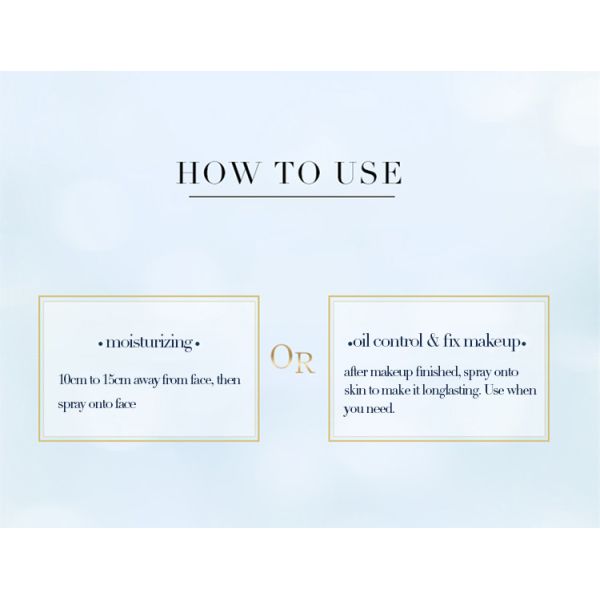 Clean your skin first, then close your eyes and spray a light mist to your face , neck and hand, flap slightly until fully absorbed; Avoid spraying into eyes.
