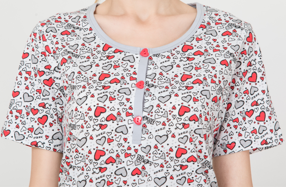 Ladies Polyester Cotton Young Love-Heart Print Short Sleeve Night Dress Contrast Binding