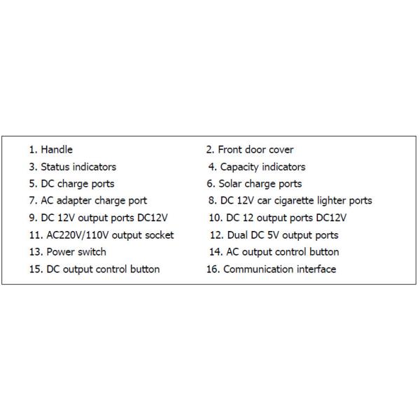 Solar charge port: This port is for charging this product by solar panel. Please well note the positive and negative when connecting of solar panel.