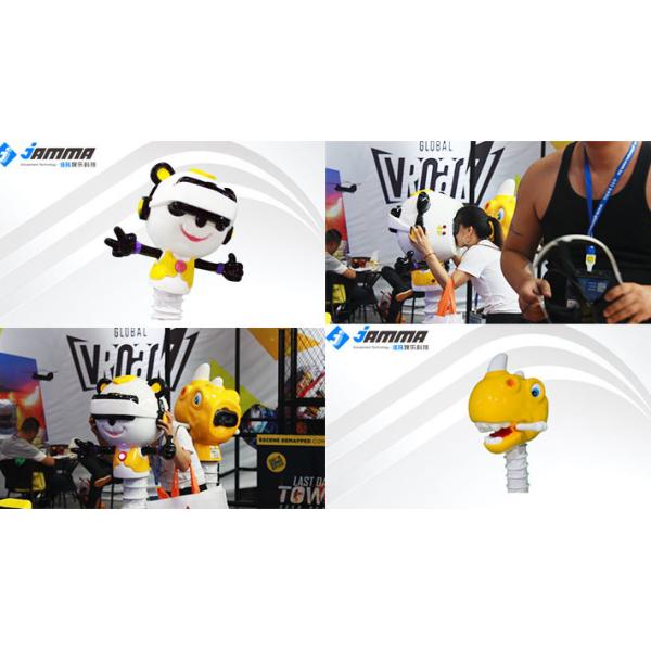 Made of stainless steel tubes, high-grade materials and an electric motor the device height can be modified by the push of a button. Children can freely move the VR headset embedded in the character's head in all direction, allowing for a complete and fun 360° movie experience.