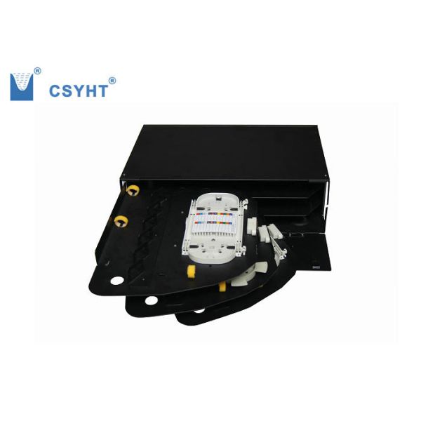 They are made of cold roll steel material, splice tray can be rotated out. It could be pre-installed with FC, SC, LC, ST ... fiber optic adapters and pigtails. It is ideal for indoor fiber optic cables connection storage, distribution and management.