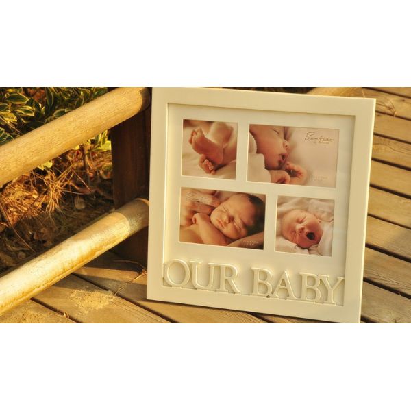 Inside the baby picture frame, there is a pre-cut mat(color can be design as you wish), and you can put 4 photos with the double sides tape, the photo size can be two 4*6'' and two 4*4''.