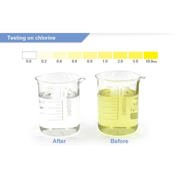 From the left picture, we could see the different testing result. We dropped the same Chlorine testing reagent into the tap water and filtered water, the water including chlorine is yellow, and the water without chlorine is clear.